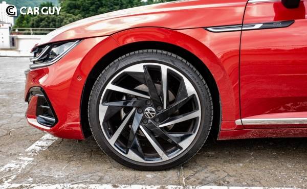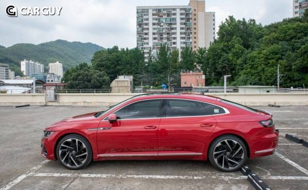 최근 세단들이 크로스오버로 바뀌면서 껑충한 디자인에 다소 엉성한 모습을 보여왔던 것과 달리 늘씬한 프로포션을 보여준다. R 라인 전용 20인치 내슈빌 휠은 아테온의 디자인과 상당히 잘 어울린다. 더욱 커 보이는 인상이다 보니 양산차답지 않은 미래적 분위기를 낸다.