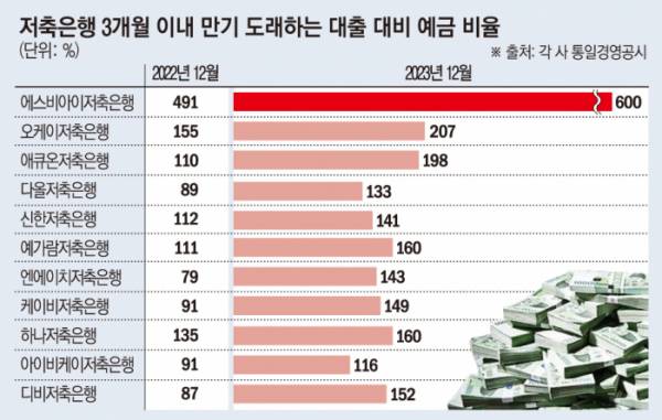 지난해 말 기준 SBI저축은행에서 3개월 내 만기가 도래하는 예수금(4조9686억 원)이 대출금(8282억 원)보다 6배 컸다. 2022년(4.9배)보다 예수금과 대출금 잔액 간 차이가 벌어졌다. OK저축은행은 2022년 말 기준 대출 대비 예금 비율이 155%였지만, 지난해에는 207%로 1년 새 52%포인트(p) 상승했다.