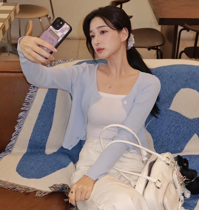 율희 님은 파스텔 톤의 하늘색 가디건과 흰 나시티와 흰 팬츠를 매치해서 청순하고 러블리한 패션을 완성했어요~ 데이트룩도 손색없겠더라고요!