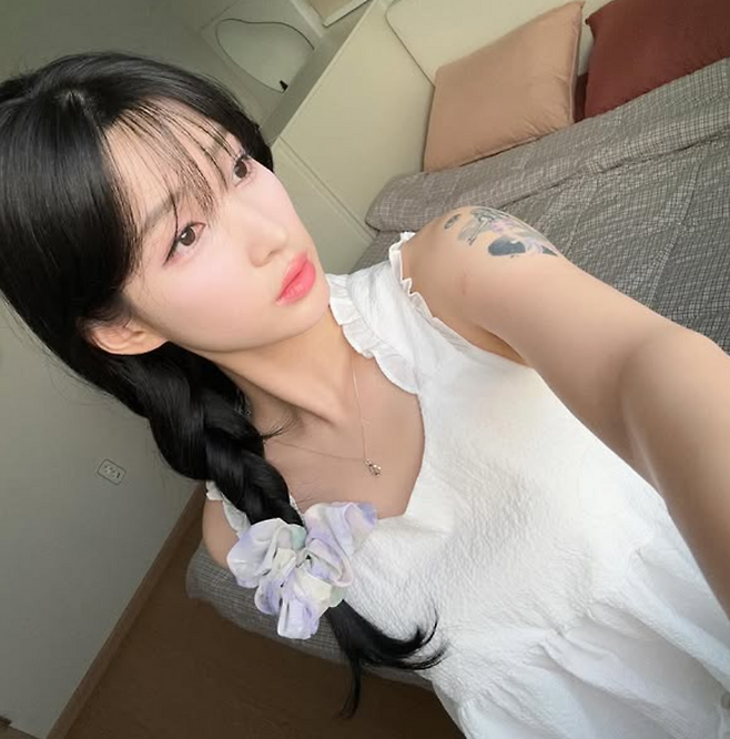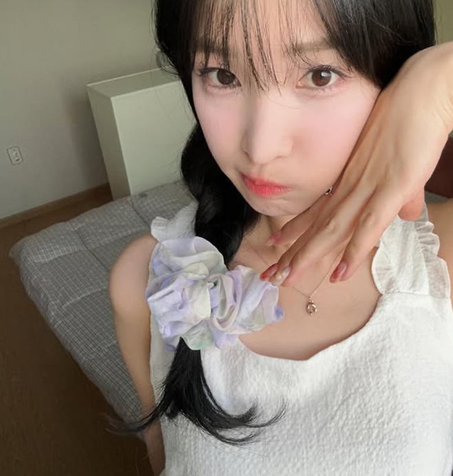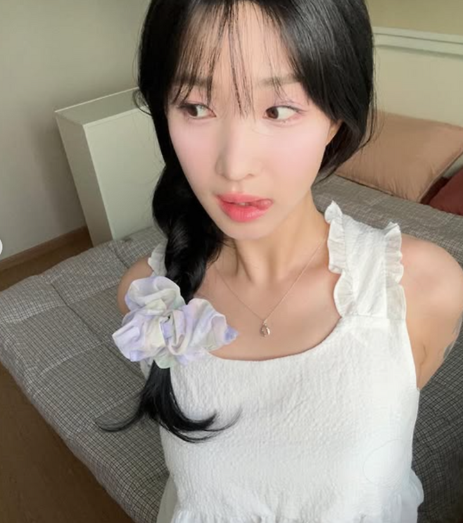 화이트 민소매 나시 티셔츠를 입고 곱창밴드로 머리를 묶어서 발랄하고 러블리한 분위기를 뽐내기도 했는데요~ 새초롬한 표정으로 귀여움도 낭낭했죠!