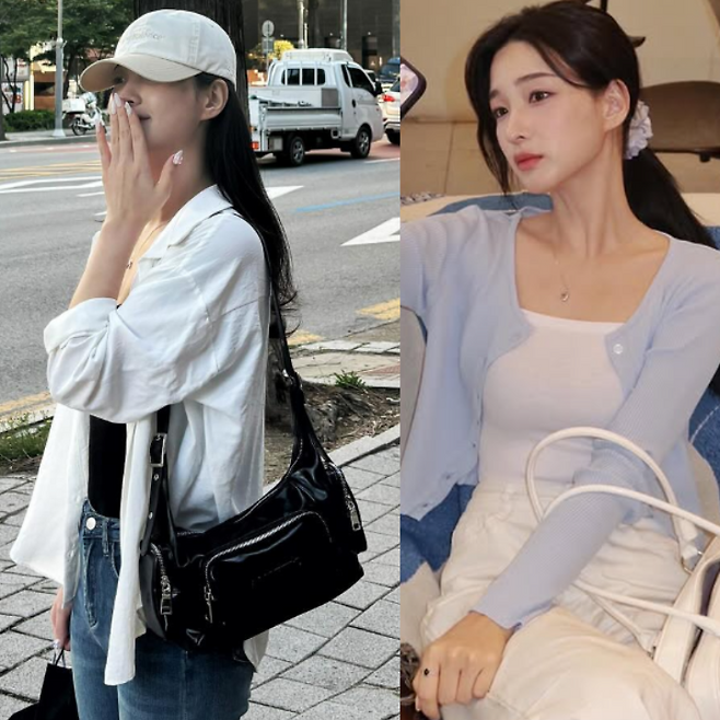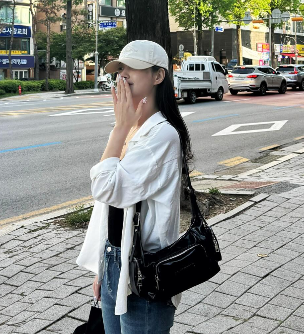화이트 셔츠를 레이어드해고 검은색 티셔츠와 청바지를 매치해서 꾸안꾸룩을 완성하기도 했는데요~ 가방은 캐주얼한 숄더백을 매치했어요. 볼캡 모자를 써보이면서 소두임을 인증했죠.
