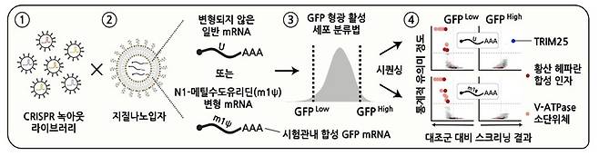연구팀은 mRNA를 제어하는 세포 내 인자들을 찾아내기 위한 연구를 계획하고, 유전자 가위를 이용한 녹아웃 스크리닝을 진행했다. 녹아웃 스크리닝은 특정 유전자의 기능을 연구하기 위해, 해당 유전자를 의도적으로 비활성화(녹아웃)시키는 연구 방법이다.