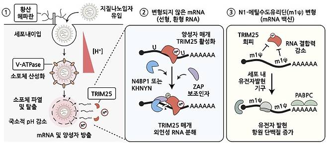 세포질 내 ‘TRIM25’라는 단백질은 바이러스 감염에 대한 선천적 반응을 조절하는 RNA 결합 단백질이자 연결효소다. mRNA가 들어왔을 때 침입자로 인식하고 제거하는 역할을 한다. TRIM25는 소포체 막이 파열될 때 나오는 양성자 이온으로 인해 활성화되는데, 외부에서 들어온 RNA에 표적·결합해 빠르게 절단하고 분해하는 방식이다.