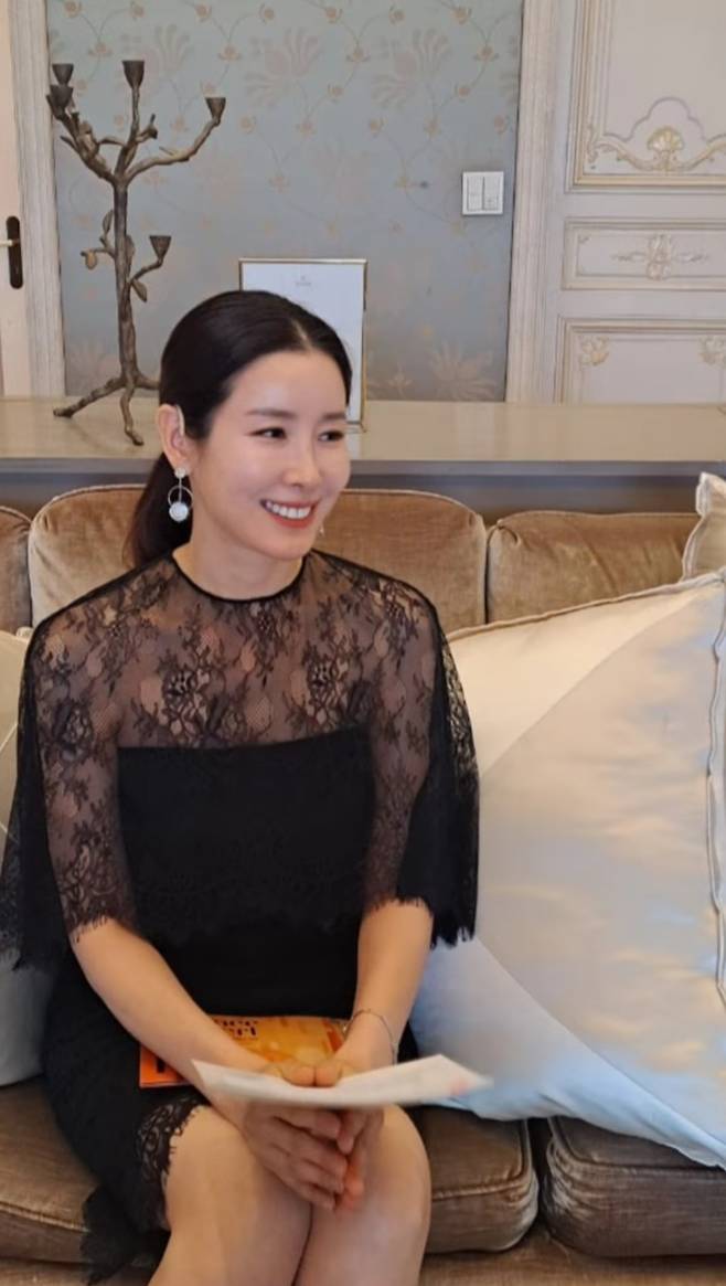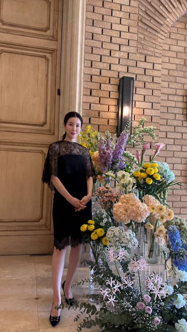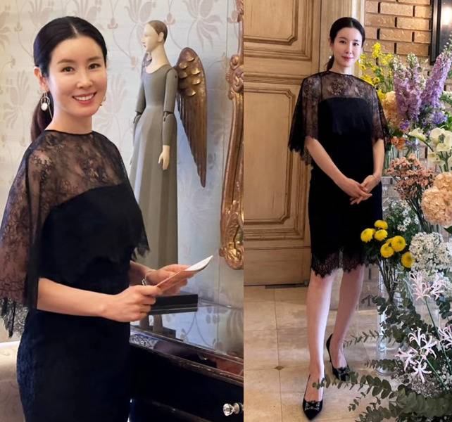 이태란이 플로럴 무드의 공간에서 레이스 블랙 드레스를 완벽히 소화하며 품격 있는 우아함을 자랑했습니다.