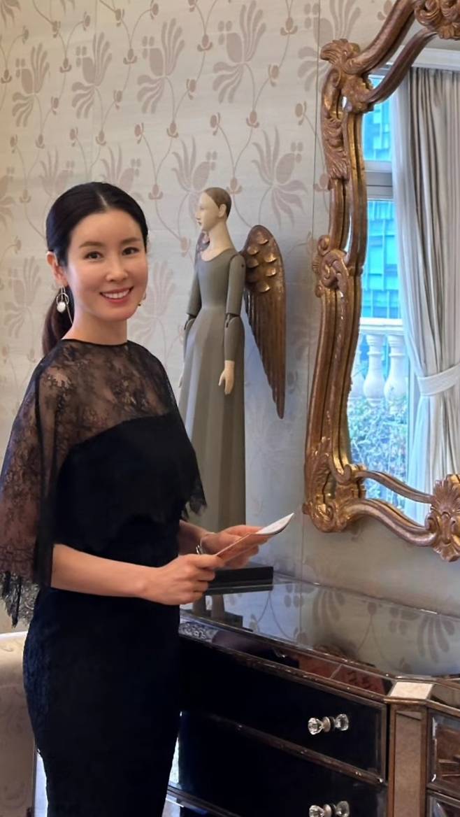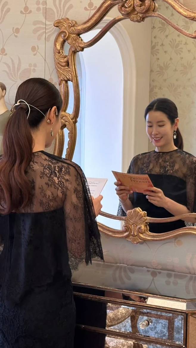 이태란은 시스루 레이스가 어깨와 소매를 감싸는 케이프 스타일의 원피스는 클래식하면서도 고혹적인 분위기를 연출했고, 레이스 끝단의 섬세한 디테일이 전체적인 룩에 고급스러운 완성도를 더했습니다.