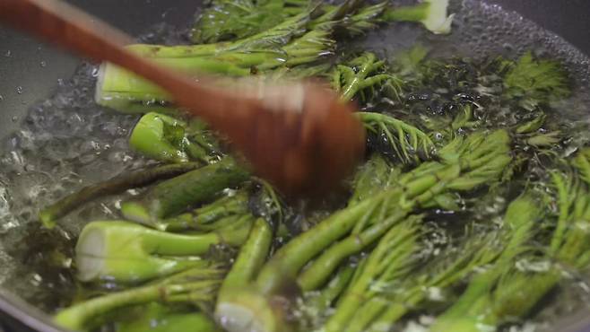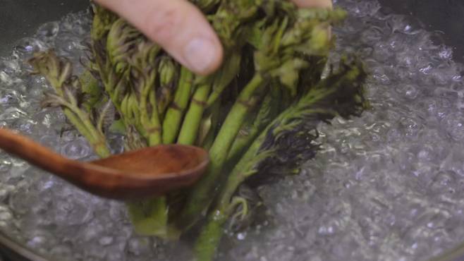 두릅을 데칠 때는 꼭지부터 넣어 주세요. 꼭지 부분은 두껍기 때문에 먼저 넣어야 알맞게 잘 데쳐진답니다.