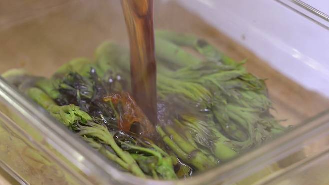 양념물이 뜨거울 때 두릅에 바로 부어 주세요. 두릅이 뜨지 않도록 접시 등으로 눌러 주세요. 한 김 식으면 뚜껑을 덮어 주세요.