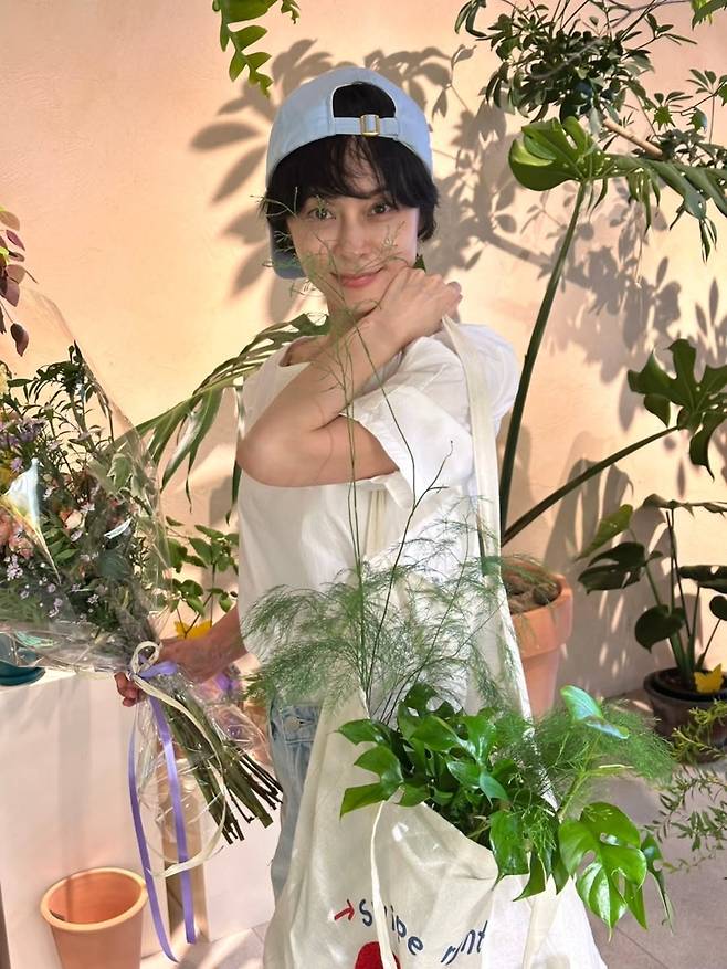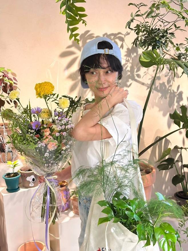 사진 속 우희진은 꽃다발과 초록 식물이 담긴 에코백을 들고 자연스럽게 포즈를 취하고 있다.
