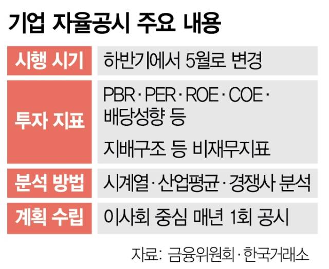 사정에 밝은 한 관계자는 "시장 기대에 부응하기 위해 당초 계획보다 앞당겨 실시할 예정"이라며 "준비된 기업부터 기업가치 제고 계획을 자율적으로 공시하기 시작할 것"이라고 설명했다.