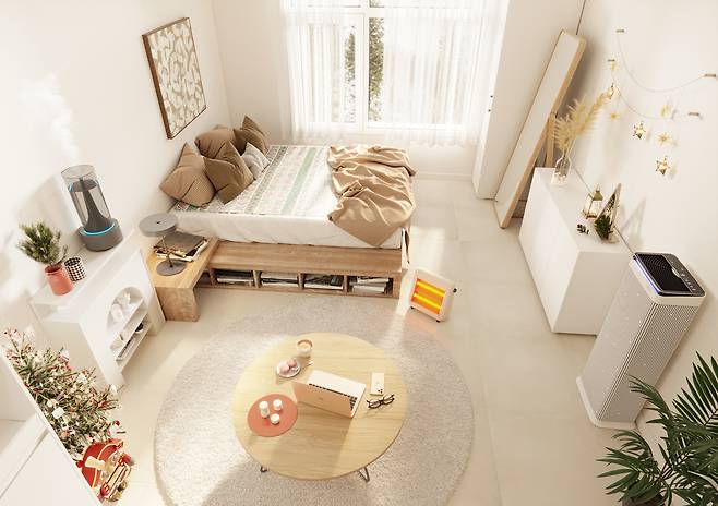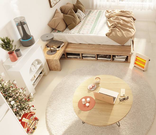 바닥에 러그와 동그란 테이블을 배치해 아늑한 휴식 공간으로 꾸몄어요. 원목 침대에 맞춰 우드톤으로 맞춰줬답니다. 아래 러그를 깔아줬지만 추울 때를 대비하여 플러스마이너스제로 2단히터를 사용해 줬어요. 화상 보호 안전망과 외적외선으로 건강한 열기가 나온답니다. 하지만 뭐니뭐니해도 가벼운(1.5kg)무게로 어디든 원하는 위치에 둘 수 있어서 편리해요!