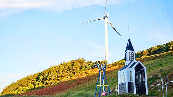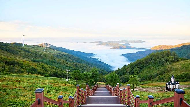이곳에서는 자연 풍경에 더해 다양한 요소들이 함께 어우러진다. 능선을 따라 설치된 풍력발전기는 고원 지형과 조화를 이루며 독특한 장면을 만든다. 또한 교회 형태의 조형물, 무지개 계단, 흔들그네, 데크길 등 여러 포토존이 조성되어 있다.