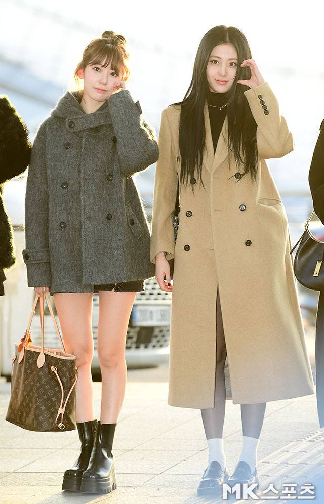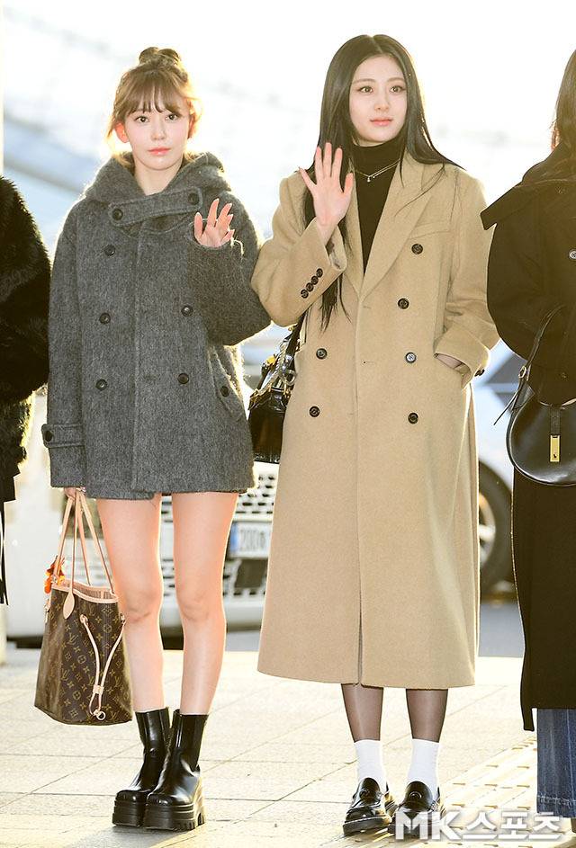 허윤진은 블랙 미니 원피스와 함께 베이지 롱코트를 매치해 우아하면서도 시크한 분위기를 연출했습니다.
