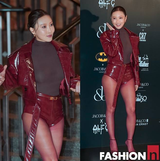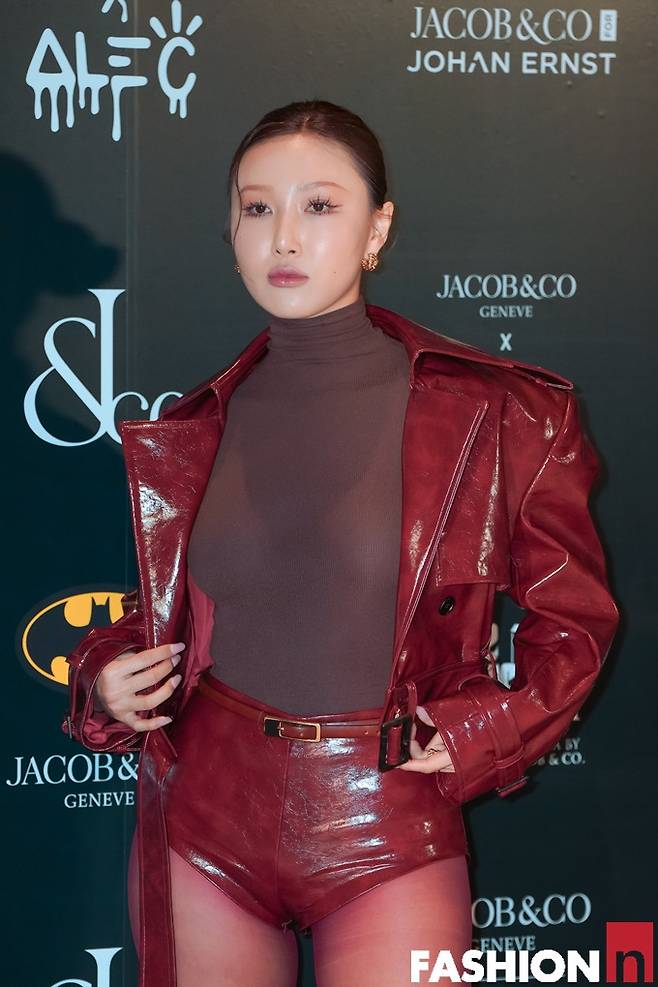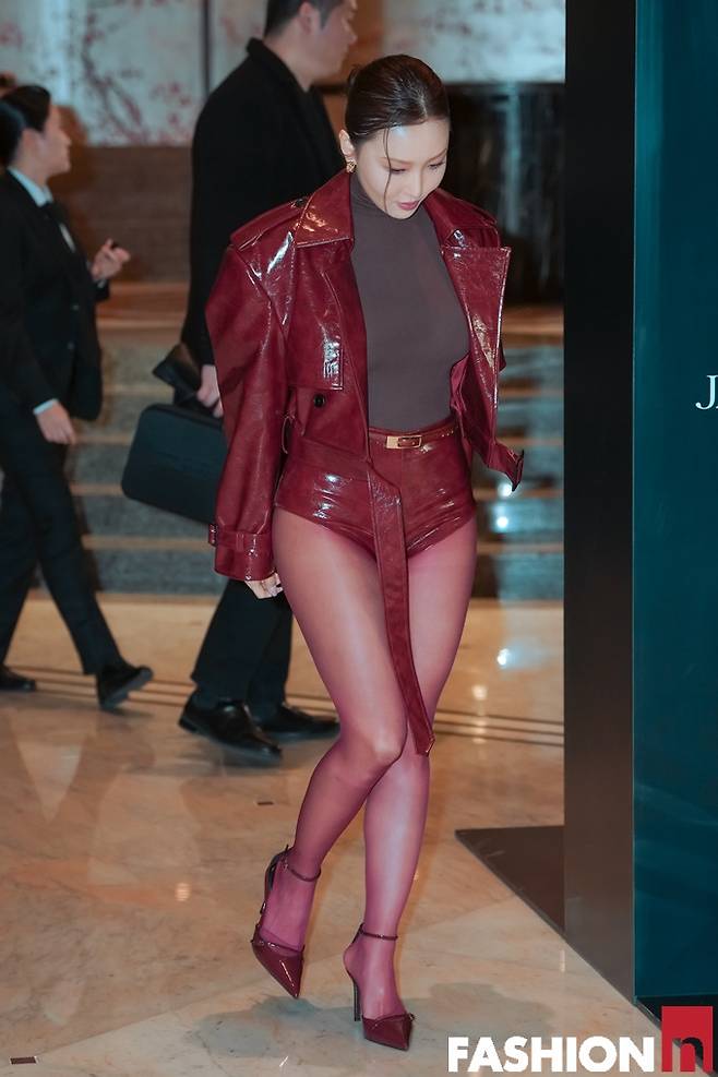 이날 화사는 탄탄한 몸매가 드러난 강렬한 버건디 컬러의 레더 쇼츠에 레더 크롭 재킷 셋업에 이너로 시스루 톱을 매치한 파격의 레더 슈트룩으로 시선을 강탈했다.