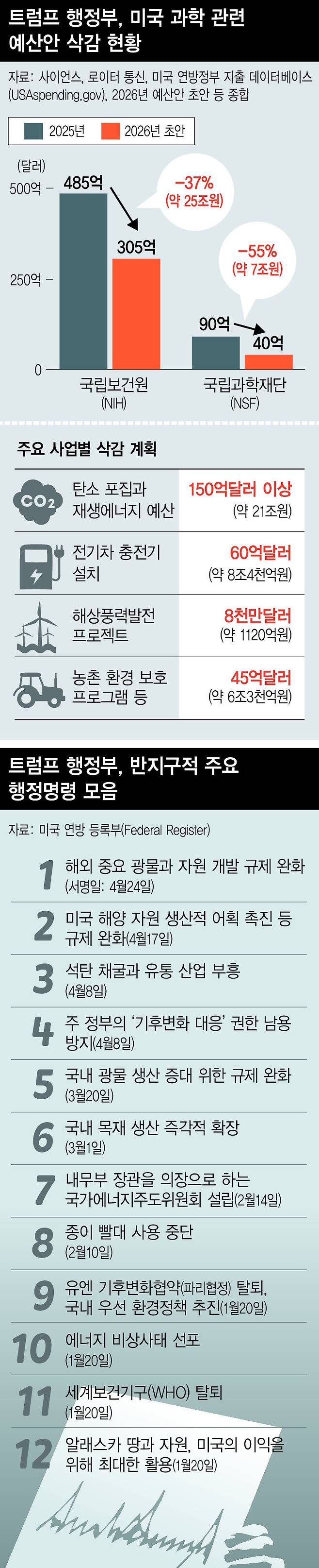 항공우주국(NASA)도 기후관측 위성 포함 53% 예산이 깎였고, 해양대기청(NOAA)도 24%, 지질조사국(USGS)도 에너지·필수광물 분야를 제외한 수질 보호와 멸종위기종 보호 등 예산 30%를 삭감했다. 환경보호청(EPA) 연구개발 예산도 46% 깎았다.