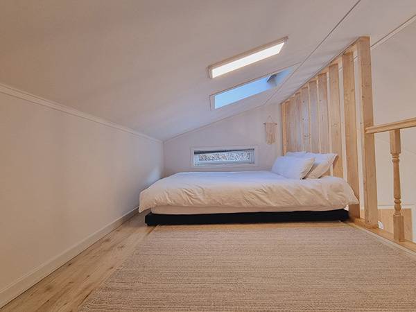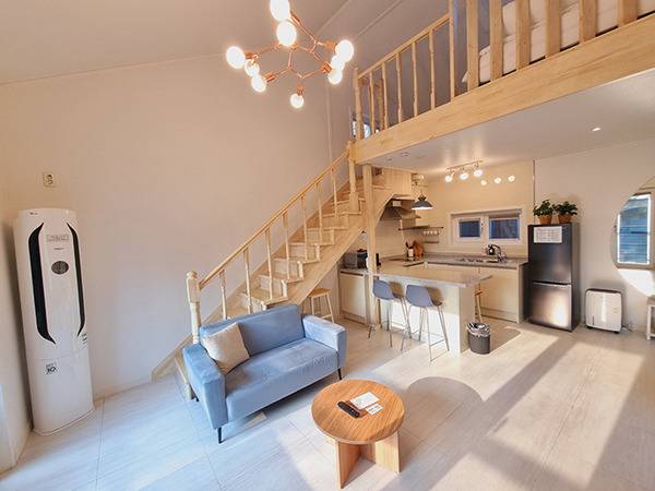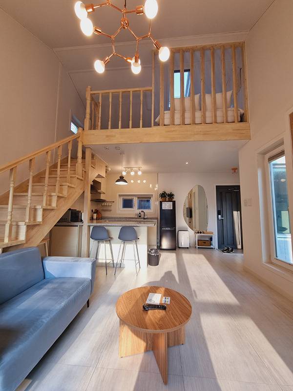우리가 이용한 객실은 복층 구조로, 아래층은 거실, 주방, 욕실, 그리고 계단을 오르면 아늑한 침실이 나온다. 특히 침실 위로 뚫린 하늘창은 아침에 눈을 떴을 때 들어오는 햇살이 정말 인상적이었다.