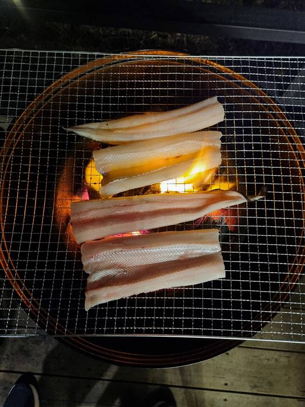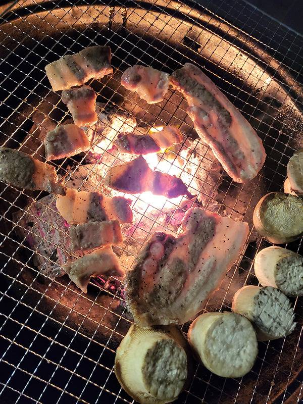 저녁 식사는 개별 테라스에서 프라이빗하게 즐기는 숯불 바비큐를 선택했다. 우리는 사장님께 미리 요청드려 숯불을 준비했는데, 숯불은 1시간 전까지 연락하면 객실별로 준비해 준다. 숯불 화력이 정말 좋아서 가져온 장어와 삼겹살, 그리고 버섯까지 환상적으로 구워 먹을 수 있었다. 신선한 재료들이 숯불 향을 입으니 그 맛이 일품이었다. 특히, 바비큐 그릴에 장어 구이와 두툼한 삼겹살을 구워 먹을 수 있다는 점이 정말 매력적이었다!