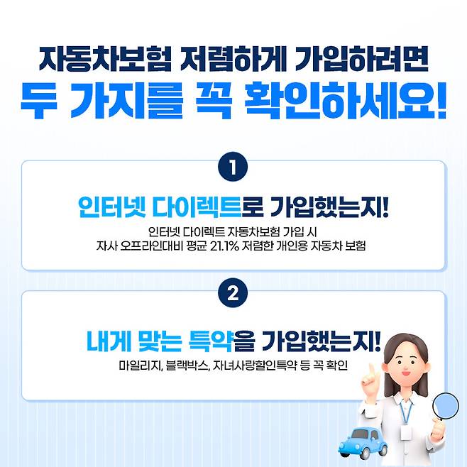“다이렉트 보험은 오프라인 가입시보다 저렴하니 꼭 확인해보세요.”