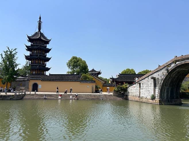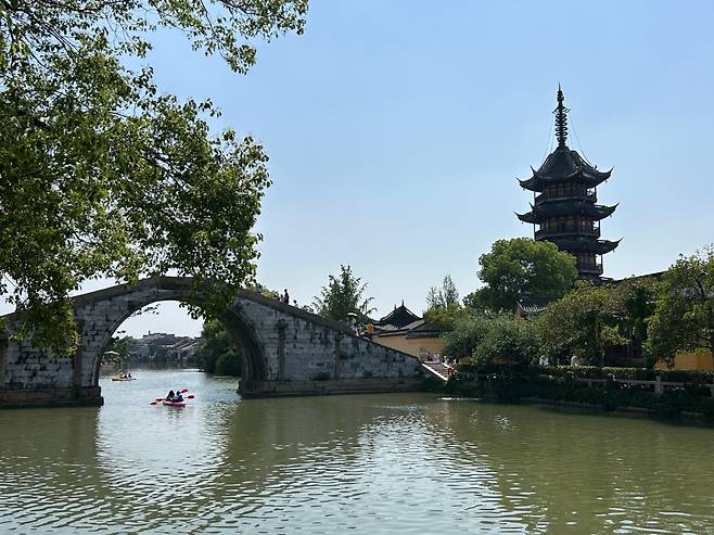 마을 안쪽으로 들어가 가장 먼저 만난 건 아치형 다리와 수로 맞은편의 거대한 탑이다. 우적교(禹迹桥)와 자운사탑이다.