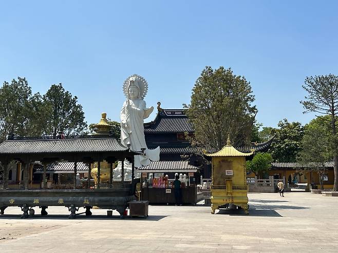 사찰 앞마당, 가장 높게 솟아있는 자운탑은 6면 5단으로, 벽돌과 나무로 구성돼 있다. 사찰이 처음 건립될 때 함께 세워졌는데 이후 몇 차례 파괴됐다 한다. 자운탑과 관련한 전설도 전해온단다. 삼국시대 손권의 여동생이 유비가 높은 곳에 올라가 바라보는 것을 그리워하며 깊은 정을 담아 ‘망부탑(望夫塔)’이라고 불렀다 한다. 또다른 이야기로는, 송 휘종(徽宗)의 딸 자운공주가 전저고진(震泽)으로 피난온 후 나라가 망한 것을 잊지 못하고, 이 탑을 중수하여 북쪽을 바라보며 부왕이 하루빨리 금나라에서 벗어나 남쪽으로 돌아가기를 기원했다고도 한다.
