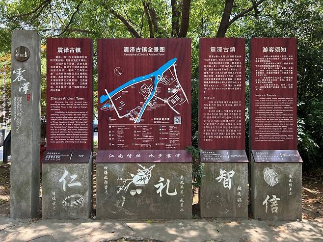 안내판의 전저고진 소개를 읽어봤다. ‘전저(震泽, 진택)는 유일하게 태호(太湖)의 별칭을 지금도 사용하는 강남의 옛 마을로 실크문화의 발상지다. 송나라 샤오싱(绍兴, 1131~1162) 때 형성된 마을로, 삼국시대 적오(赤乌, 238년 8월 ~ 251년 4월) 때 지어진 자운사탑, ‘강남 제1당’로 불리는 ‘사검당’, 왕세전 기념관, 우적교 등 많은 고대 유적이 남아 있다.‘
