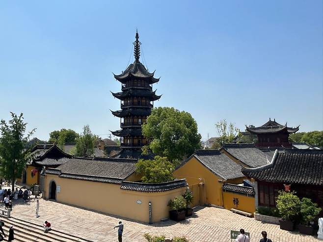 사찰 앞마당, 가장 높게 솟아있는 자운탑은 6면 5단으로, 벽돌과 나무로 구성돼 있다. 사찰이 처음 건립될 때 함께 세워졌는데 이후 몇 차례 파괴됐다 한다. 자운탑과 관련한 전설도 전해온단다. 삼국시대 손권의 여동생이 유비가 높은 곳에 올라가 바라보는 것을 그리워하며 깊은 정을 담아 ‘망부탑(望夫塔)’이라고 불렀다 한다. 또다른 이야기로는, 송 휘종(徽宗)의 딸 자운공주가 전저고진(震泽)으로 피난온 후 나라가 망한 것을 잊지 못하고, 이 탑을 중수하여 북쪽을 바라보며 부왕이 하루빨리 금나라에서 벗어나 남쪽으로 돌아가기를 기원했다고도 한다.