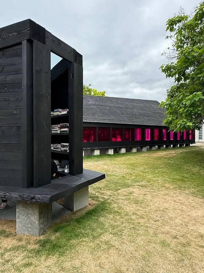 내츄럴한 검은 목재와 돌의 연결은 전통건축의 초석위에 기둥을 세우는 기법이 현대화되고 공원의 파빌리온의 특성에 맞게 전용된 듯했다. 내가 한국인이어서 일까? 구법과 디테일에서 배어 나오는 한국성을 본 듯했다. (일부러 건축가인 조민석의 파빌리온에 대한 설명은 보지 않았다. 내가 찾고 읽는 그 맛을 놓치고 싶지 않아서)