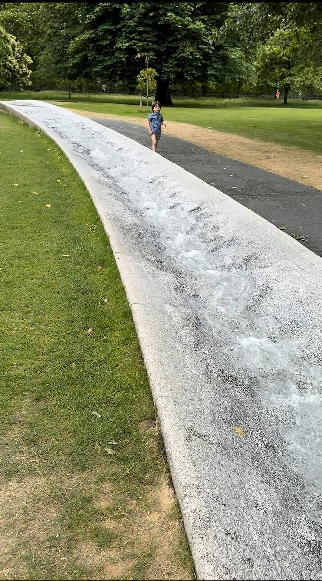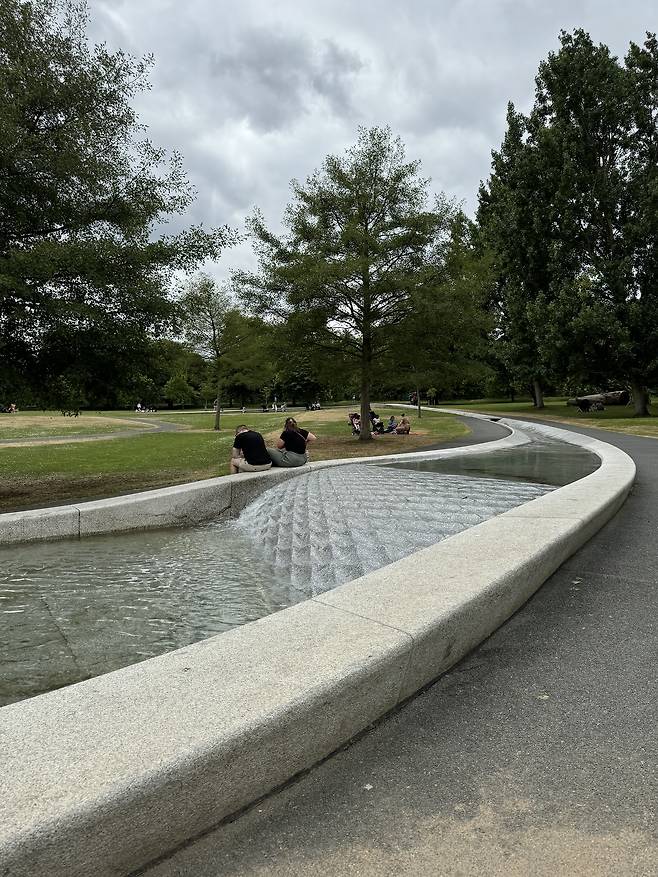런던 하이드 파크에는 다이애나 황태자비를 기리는 장소가 있었다. 둥근 원형의 물살이 이어지는 바닥에 깔린 조형물이었다. 설명을 듣기 전에는 이곳이 다이애나 황태자비를 기리는 그렇게 대단한 곳 일 것이라고 알 수가 없었다. 그 설명도 아주 소박하게 적혀 있었다. 그 물길의 조형은 사람의 인생을 표상하는 것이라 하였다. 물길을 이루는 재질과 패턴, 깊이, 경사에 따라 물살의 크기, 물이내는 소리가 달랐다. (작품을 따라 걸으면 찍은 동영상을 못 올리는 것이 아쉽다.)이 작품의 작가는 Kathryn Gustafson으로 긴 물길의 변화가 사람들의 인생을 표현하고 싶었다 한다. 태어나서 격동기 청년을 지나 인생의 장년기를 넘어 차분히 인생을 정리하는 노년기를 그렸다. 그리고 그곳은 누구나 신발을 벗고 들어갈 수 있는 아이들의 놀이터가 된다고 한다. 다이애나 황태자비를 기리는 조형물인 이곳은 아주 나즈막히 하이드파크에 자리를 잡은 것이다. 그리고 그 자연에 인간의 인생사를 조심히 앉혔다. 그리고 아이들에게, 사람들에게 한없이 열어주고 있었다.
