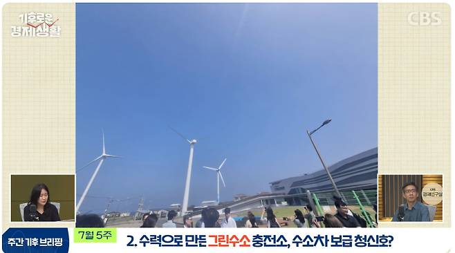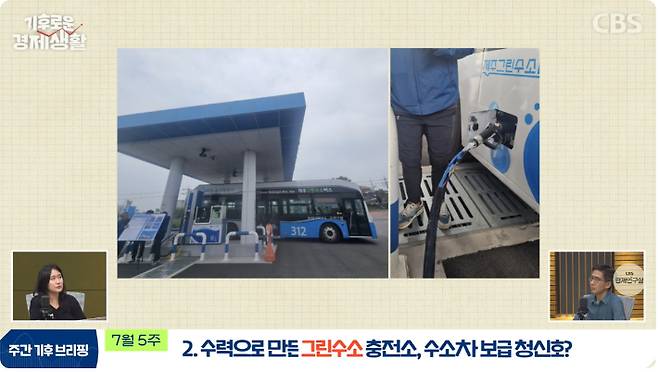 ◇ 최서윤> 맞습니다. 수소경제에 대해 회의적인 관점을 가지신 분들도 계시잖아요. 가져온 이야기는 바로 그린수소와 관련된 겁니다. 수소를 생산하는 과정에서 화석연료 사용하면서 탄소배출 하면 굳이 비싼 돈 들여서 수소를 만들 필요가 없잖아요. 근데 수소를 만들 때 물을 전기 분해하는 과정에서 필요한 전기를 수력 발전으로 생산한 그린수소 충전소가 국내 최초로 문을 열었다는 소식입니다.