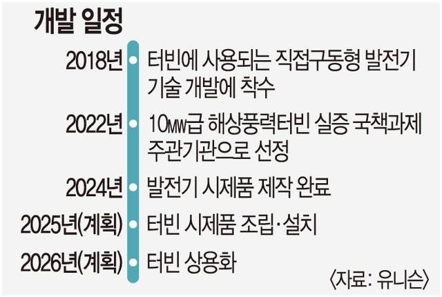 그럼에도 유니슨은 국내 최대급인 10㎿급 풍력터빈 개발이 새로운 도약의 기회가 될 것으로 기대하고 있다. 올해 내로 발전기의 UL 부품인증시험 절차를 완료한 뒤 터빈 시제품을 내년까지 완성할 계획이다. 한전과 발전공기업이 주도하는 해상풍력 프로젝트를 10㎿ 모델의 주요 공급처로 삼겠다는 목표다. 지난 8월 산업통상자원부가 발표한 해상풍력 입찰 로드맵에 따르면 내년 상반기부터는 공공주도형 별도 입찰 시장이 마련될 예정이다.