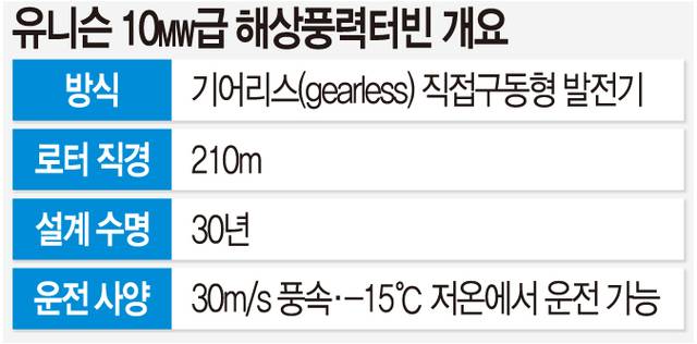 유니슨은 2018년 대형 풍력터빈에 필요한 직접구동형 발전기 기술 개발을 시작했다. 기존에 주로 4㎿ 모델들을 만들어온 유니슨이 해상풍력에 투입할 10㎿ 모델을 개발하는 것은 새로운 도전이었다. 10㎿ 모델의 가장 큰 특징은 회전 속도를 높이는 역할을 하는 기어(Gear)박스를 제외하고 직접 구동되는 영구자석 발전기를 장착했다는 점이다. 기어박스를 제외하면 구조가 단순해져 고장을 줄일 수 있다. 먼바다에 설치돼 수리나 부품 교체가 어려운 해상풍력 특성상 유지·보수 건수를 줄이는 것이 우선이라 판단한 것이다. 박인하 WTG(풍력터빈)생산팀 부장은 “거센 바람과 폭풍을 버티며 30년을 돌아갈 터빈 제작을 목표로 하고 있다”고 말했다. 터빈 주요 부품도 다중화 시스템을 적용해 부품이 고장 나더라도 정지 시간을 최소화할 계획이다.