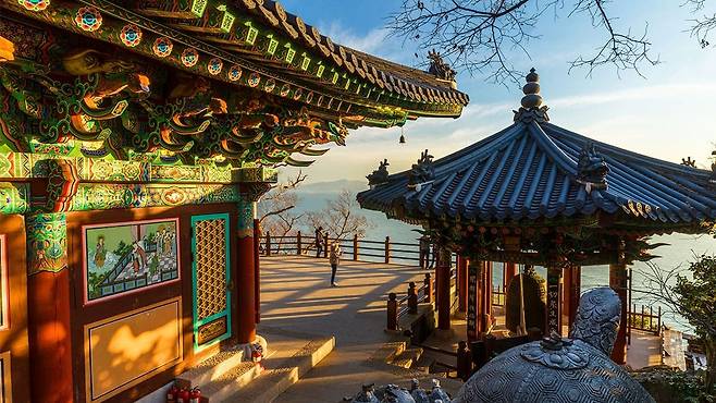 붉게 물든 바다가 하늘과 맞닿으며 빛을 쏟아내는 순간, 절벽 위 사찰은 황금빛으로 물들고 방문객들은 숨을 죽인 채 경건하게 그 장면을 맞이한다.