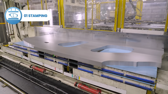 2차원 평면 형태의 철판은 총 4단계의 스탬핑을 거쳐 차체를 이룰 3차원 입체 형상으로 거듭난다. 1단계에서 입체적인 모양으로 만들고, 2단계에서는 필요 없는 부위를 잘라낸다. 3단계는 부위별로 구부리고 볼트 박을 자리의 구멍을 뚫고, 4단계에서 더욱 정교하게 다듬는다. 각 단계는 3초 만에 마친다. 이때 수직으로 누르는 압력은 1,600톤에 달한다.
