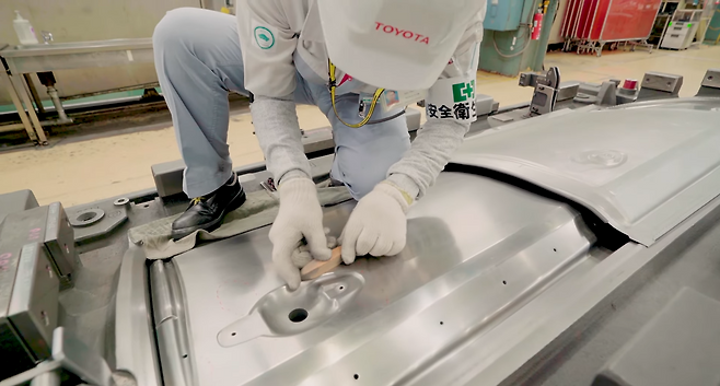강판이 매끄럽고 아름다운 보디로 거듭나기 위해선 찍어 누를 틀이 정교해야 한다. 스탬핑 과정은 자동화했지만, 틀을 만드는 과정엔 사람이 손길이 필요하다. 여기서 토요타가 자랑하는 ‘타쿠미’가 활약한다. 스탬핑을 시험 가동한 뒤 패널을 숙련공이 빛을 비춰보고 손으로 쓰다듬어 1,000분의 1㎜(미크론) 단위의 정밀도로 변형이나 크랙이 없는 지 살핀다.