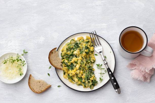 • 데친 양배추 위에 스크램블 에그를 올려요.