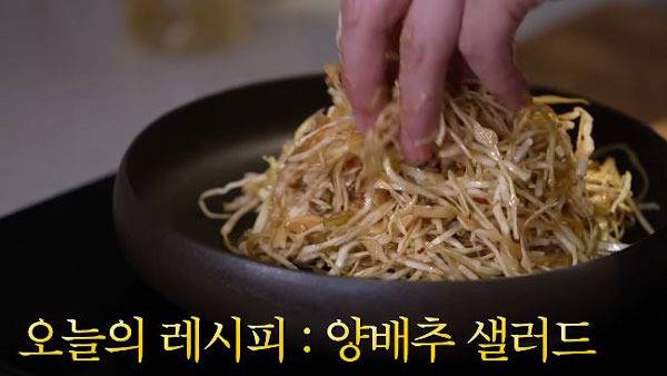 성시경은 "이건 무조건 맛있지 않을까 싶다. 양배추가 몸에 좋다"며 양배추를 채썬 후 샐러드 소스와 올리브오일을 함께 넣어 완성했어요.