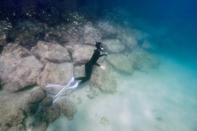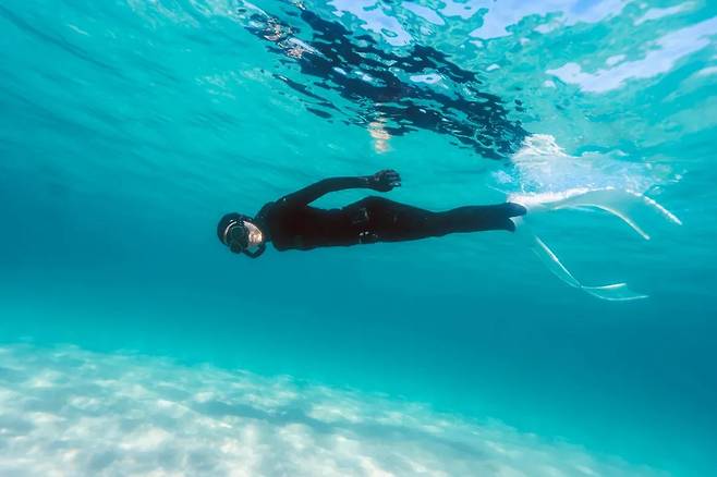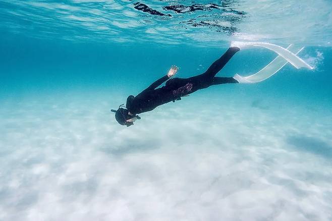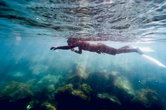 전신 슈트와 스노클, 그리고 긴 핀을 착용한 채 바위 사이를 유영하는 모습에서조차 우아함이 묻어난다.