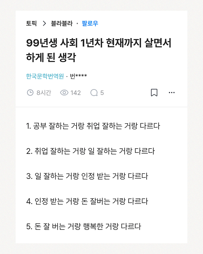 99년생 사회초년생이 최근에 깨달았다는 인생의 진실