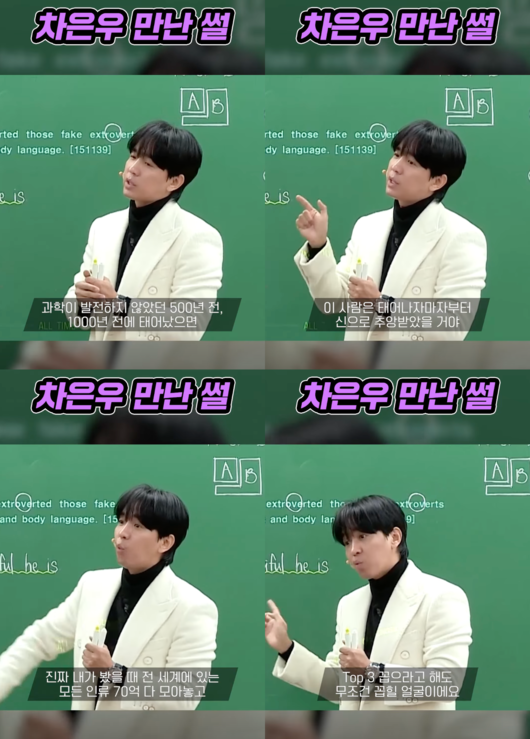 이날 조정식 강사는 "차은우 씨 실물을 보고 느낀 감정은 이렇게 정리할 수 있을 것 같다. 인간 내면의 아름다움이란 얼마나 하찮은 것인가"라고 말했다.