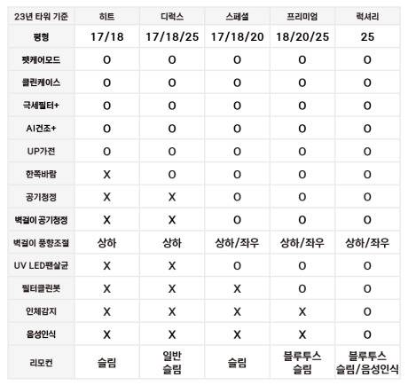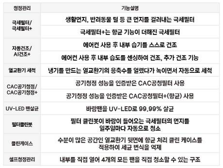 특히 청정관리 파트에서 차이가 많은데, 세부적인 기능을 살펴보면 아래와 같습니다.