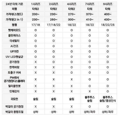타워, 타워2는 등급에 따라 다르지만, 히트를 제외하면 한쪽 바람(양 쪽 바람문 중 한 쪽만 닫아 찬바람을 직접 맞지 않게 냉방하는 기능) 기능이 추가됩니다.