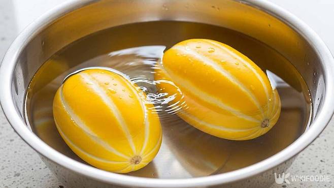 1. 참외를 50도 정도의 따뜻한 물에 3분 담근 뒤 껍질을 문질러 씻는다.