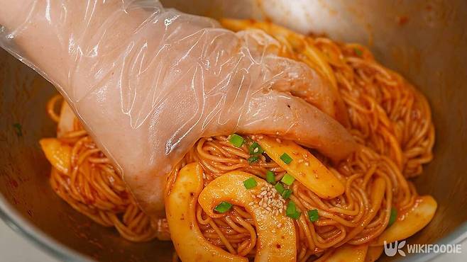 6. 국수와 얇게 썬 참외를 섞은 뒤 양념장을 넣고 버무린다.