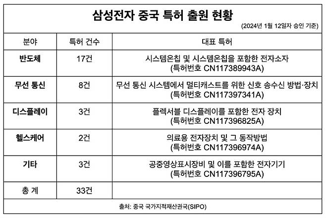 지난 16일(현지시간) 중국 국가지적재산권국(SIPO)에 따르면, SIPO는 삼성전자가 2016~2023년 출원한 특허 총 133건을 올 초 승인했다. 삼성전자는 반도체와 5G·6G 통신, 홀로그램, 플렉시블 디스플레이 등 관련 기술과 장치에 대한 지적재산권을 손에 넣었다.