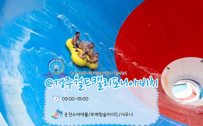 보분관광단지의 자랑인 경주월드 옆에 위치한 여름 한정 워터파크, 경주월드 캘리포니아비치입니다.