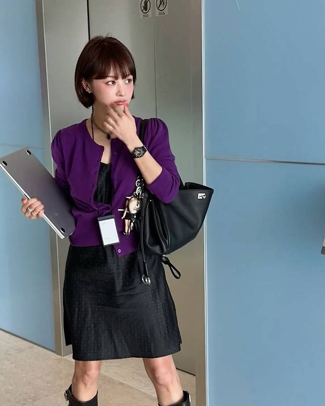 임지현처럼 퍼플 가디건을 오피스 룩에 활용하고 싶다면, 기본 블랙 슬립 드레스 위에 가볍게 걸쳐주는 것이 좋다. 여기에 심플한 액세서리와 스퀘어 백을 매치하면 세련된 출근룩을 손쉽게 완성할 수 있다. 부츠 대신 블랙 플랫슈즈나 스니커즈로 스타일을 살짝 캐주얼하게 풀어도 멋스럽다.