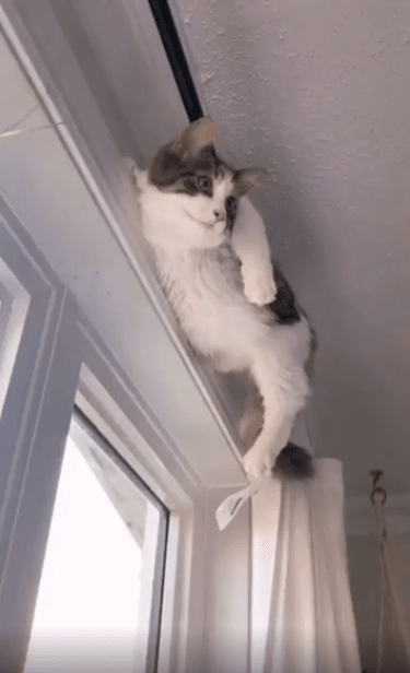 실내 벽과 창문 사이, 높은 곳에 설치된 커튼봉. 대부분의 사람에겐 그저 커튼을 걸기 위한 구조물이지만, 고양이에겐 그 위가 바로 ‘세상의 중심’이 되는 곳입니다.