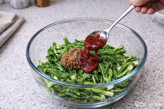 준비한 양념장은 두릅에 한꺼번에 다 넣기보다 무치는 상태를 보며 조금씩 더하는 것이 좋다. 두릅이 부서지지 않게 힘을 빼고 가볍게 버무린다.
