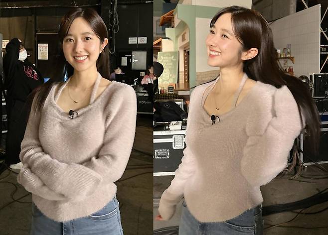 이혜성은 앙고라 홀터넥 스웨터를 착용해 사랑스럽고 포근한 분위기를 자아냈습니다.