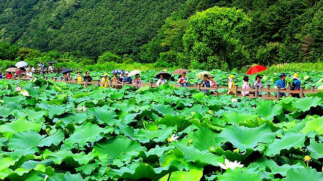 평소엔 상수원 보호구역으로 일반인의 출입이 제한되어 있는 이곳. 하지만 7월 중순부터 8월 중순까지, 연꽃이 절정을 이루는 시기에 한정해 특별한 탐방 프로그램이 운영된다.