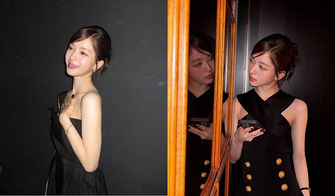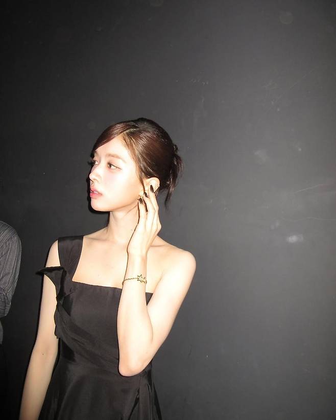 첫 번째 사진 속 노정의는 어깨 라인이 드러나는 오프숄더 블랙 드레스를 입고 있다. 비대칭적인 디자인과 풍성한 플레어 라인이 조화를 이루며 단아하면서도 섹시한 매력을 발산한다. 묶은 머리에 골드 이어링, 그리고 블랙 네일과 얇은 팔찌로 마무리된 스타일링은 절제미의 정점을 찍는다.